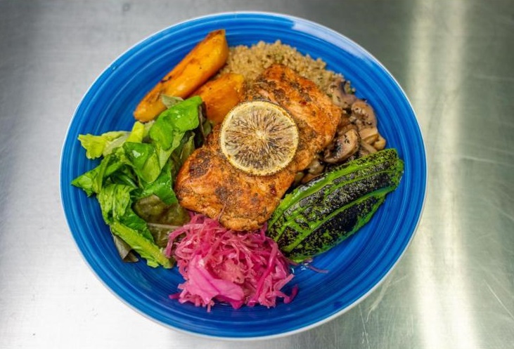 Quinoa, roasted sweet potatoes, sautéed mushrooms, pickled cabbage, avocado, sprouts