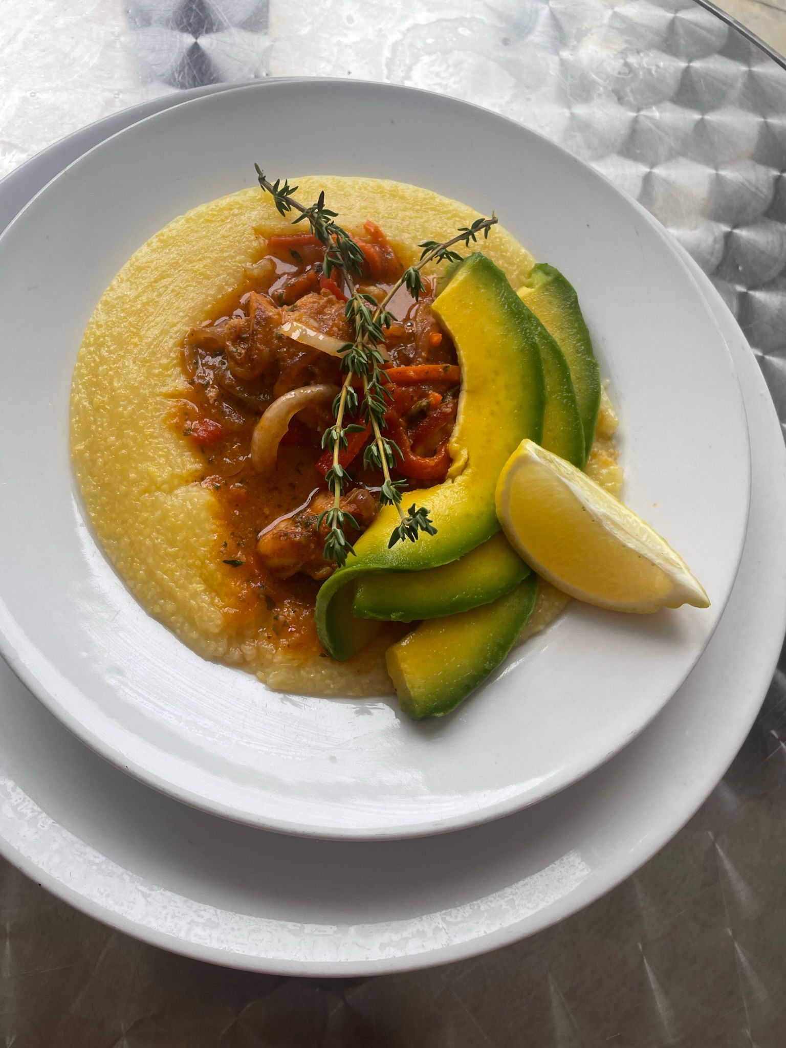 cajun seasoned shrimp in a light tomato based sauce served over yellow grits with a side of gluten free toast